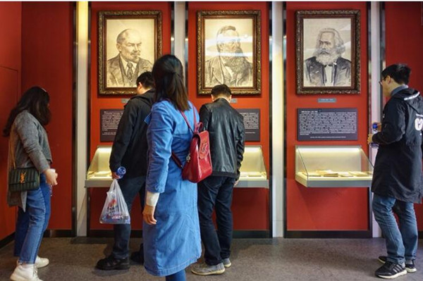 老师们认真参观展厅展品 一百年前,3000余名北京学生群情激愤,举着“外争主权,内除国贼”的旗帜,从红楼出发,沿天安门、东交民巷,一路进至赵家楼,由此掀开了中国现代史上爱国主义运动光辉一页。今日的五四大街,雨后初霁,春风拂柳,老师们带着还不曾平静下来的思绪,离开红楼,追寻先驱者们的足迹,重走五四之路。行走在路上,支部书记陈远亮为大家再次详细介绍了五四运动的经过及重大意义。