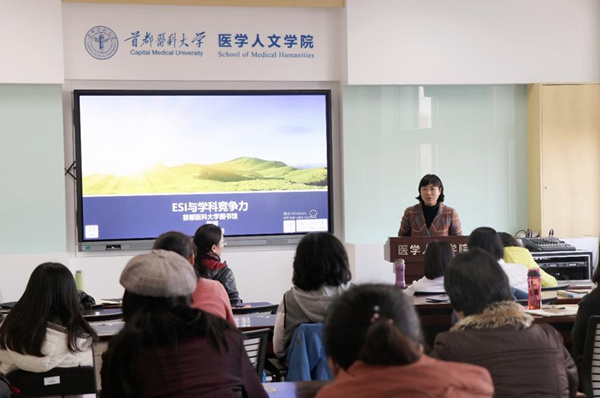 在前期图书馆帮助学院做学科分析报告和 web of science论文分析的基础上,黄芳馆长以《ESI与学科竞争力》为题,从国内外学科评估、学科数据来源、ESI的应用,包括ESI的收录范围、特点、研究前沿追踪以及如何利用医学文献数据库获得高水平期刊等方面进行了讲解。详尽的数据分析、可视化的呈现,清晰显示出学院学科在学校社会科学、临床医学评价中的潜力作用,她建议学院要充分利用数据库资源,注重科研实效和提升学术影响力,主要从内部提升、外部引进、基础保障三方面着手,不断提升学科竞争力。 讲座中,两位老师娓娓道来,内容紧贴实际,有很强的指导作用。与会教师认真聆听,在提问环节,对学院教师们提出的问题,王晶老师和黄芳馆长一一解答。两位老师的讲解调动了学院教师的热情和积极性,增强了教师的申报信心,提升了教师对学科分析指引科研开展的认知。