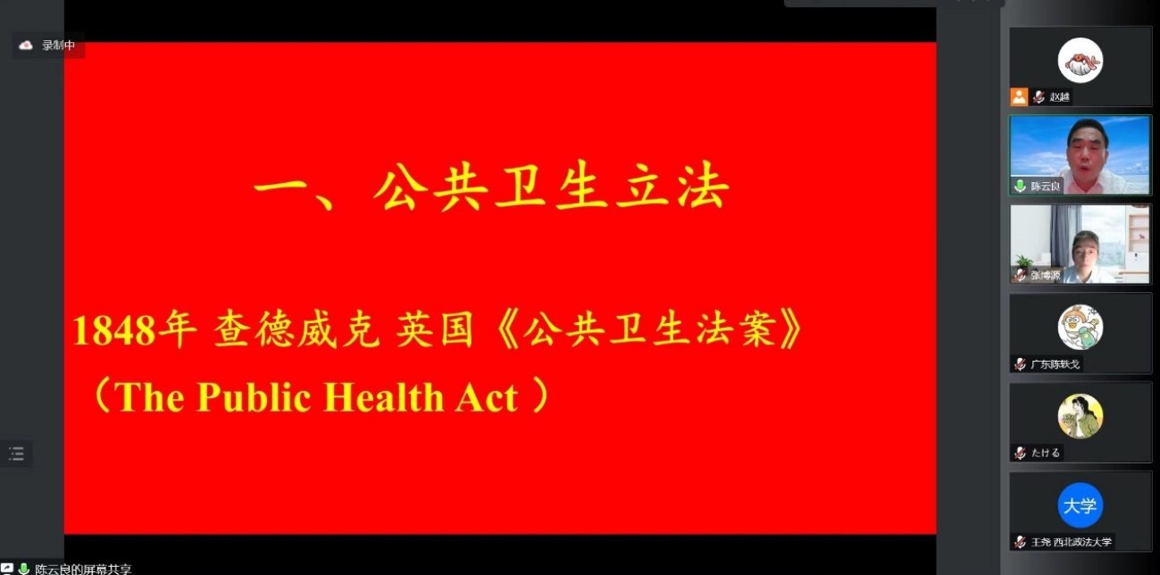 中国卫生法学会副会长、广东外语外贸大学法学院陈云良教授为“卫生法学名家讲坛”第四讲作了“公共卫生的立法与执法问题”的报告,卫生法学研究中心副主任张博源副教授主持讲座。陈教授首先从比较法层面,介绍了英国、美国、法国等国家的公共卫生立法现状,提出大陆法系国家大多建立以《传染病防治法》为核心的公共卫生法体系。之后,详细介绍了我国公共卫生法体系的构成,纵深讨论公共卫生立法的“法典化”的问题。陈教授还具体分析了卫健委在卫生行政执法过程中的地位和功能,评价了委托执法对卫生监督执法的影响。指出公共卫生应急执法体制下,应当引入公共卫生治理理论应对疫情防控的常态化,以颇具创新性的理论视角,有效启发师生们的理论思考。