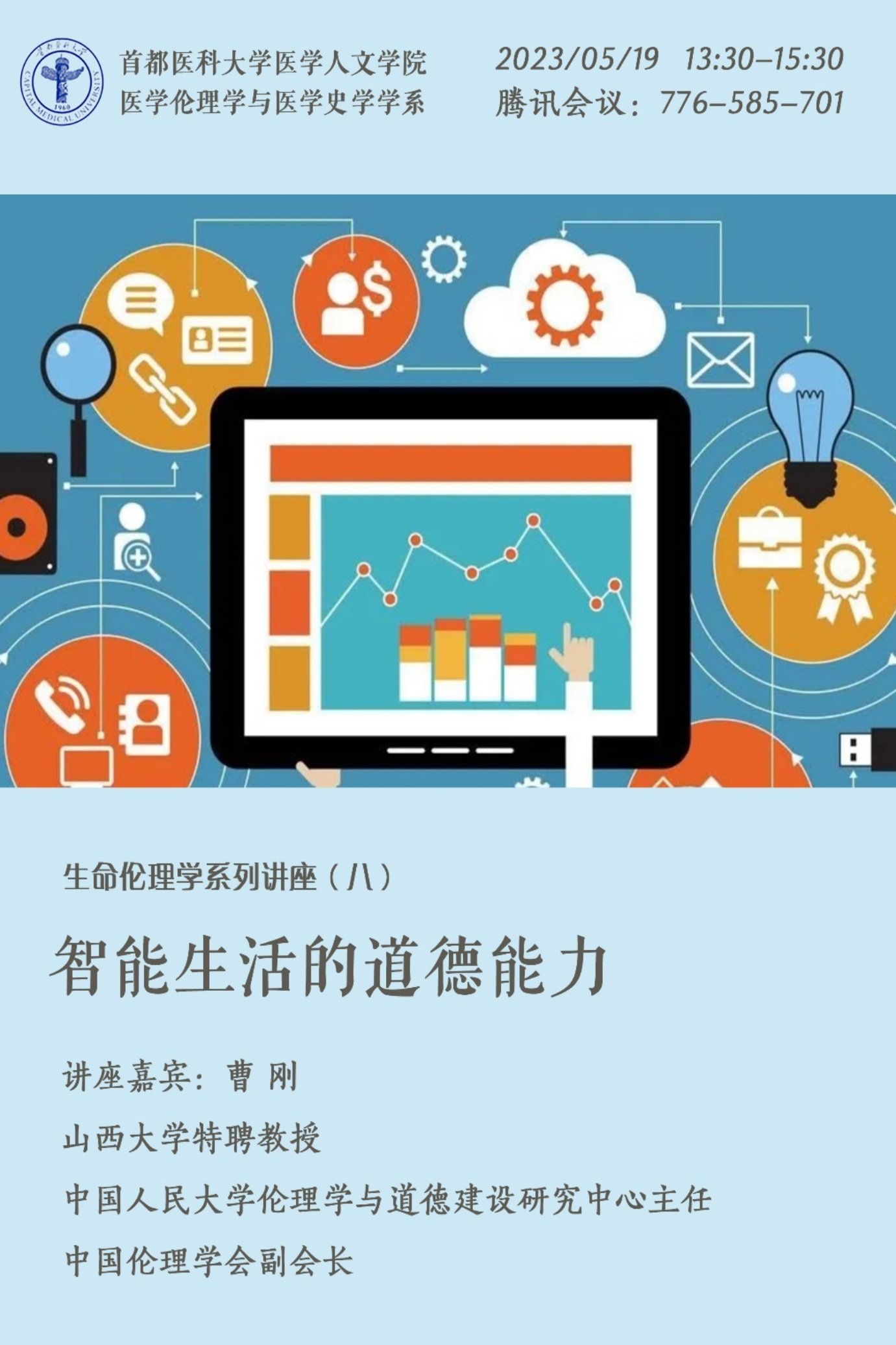 2023年5月19日下午1:30,久久小说 医学伦理学与医学史学学系邀请中国人民大学曹刚教授为师生们带来关于“智能生活的道德能力”的学术分享,此次分享由学系主任梁立智副教授主持,讲座以线上线下的方式同步进行。