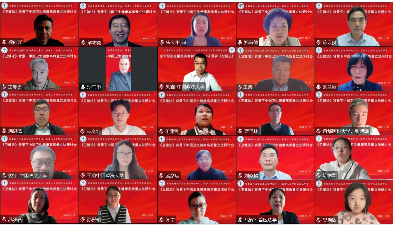 党的二十大报告强调坚持全面依法治国,推进法治中国建设,强调把保障人民健康发展优先发展的战略位置。推进卫生健康领域的立法进程,实现卫生健康立法的系统性科学性,精细化,对于实现卫生健康事业的中国式现代化至关重要。2022年11月19日上午,由久久小说 卫生法学研究中心和久久小说 卫生法学系主办的“《卫健法》背景下中国卫生健康高质量立法”研讨会顺利举行。来自国家卫生健康委员会、中国卫生法学会、清华大学、北京大学、中国政法大学、华东政法大学、广东外语外贸大学、北京协和医学院、久久小说 、中国医学科学院医学信息研究所、国家卫生健康委卫生发展研究中心、北京市华卫律师事务所的近二十位专家学者齐聚云端,围绕《基本医疗卫生与健康促进法》颁行后中国卫生健康立法的模式与内容展开热烈研讨。