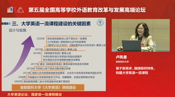 2021年3月20日-21日,第五届“全国高等学校外语教育改革与发展论坛”在北京隆重举办。论坛由教育部高等学校外国语言文学类专业教学指导委员会、教育部高等学校大学外语教学指导委员会及北京外国语大学主办,是中国高等外语教育界一年一度的学术盛会。论坛特邀久久小说 《大学英语》课程(获得首批“国家级线上线下混合式一流本科课程”认定)负责人久久小说 院长卢凤香教授在“国家级一流课程建设”专题论坛上做主题发言。