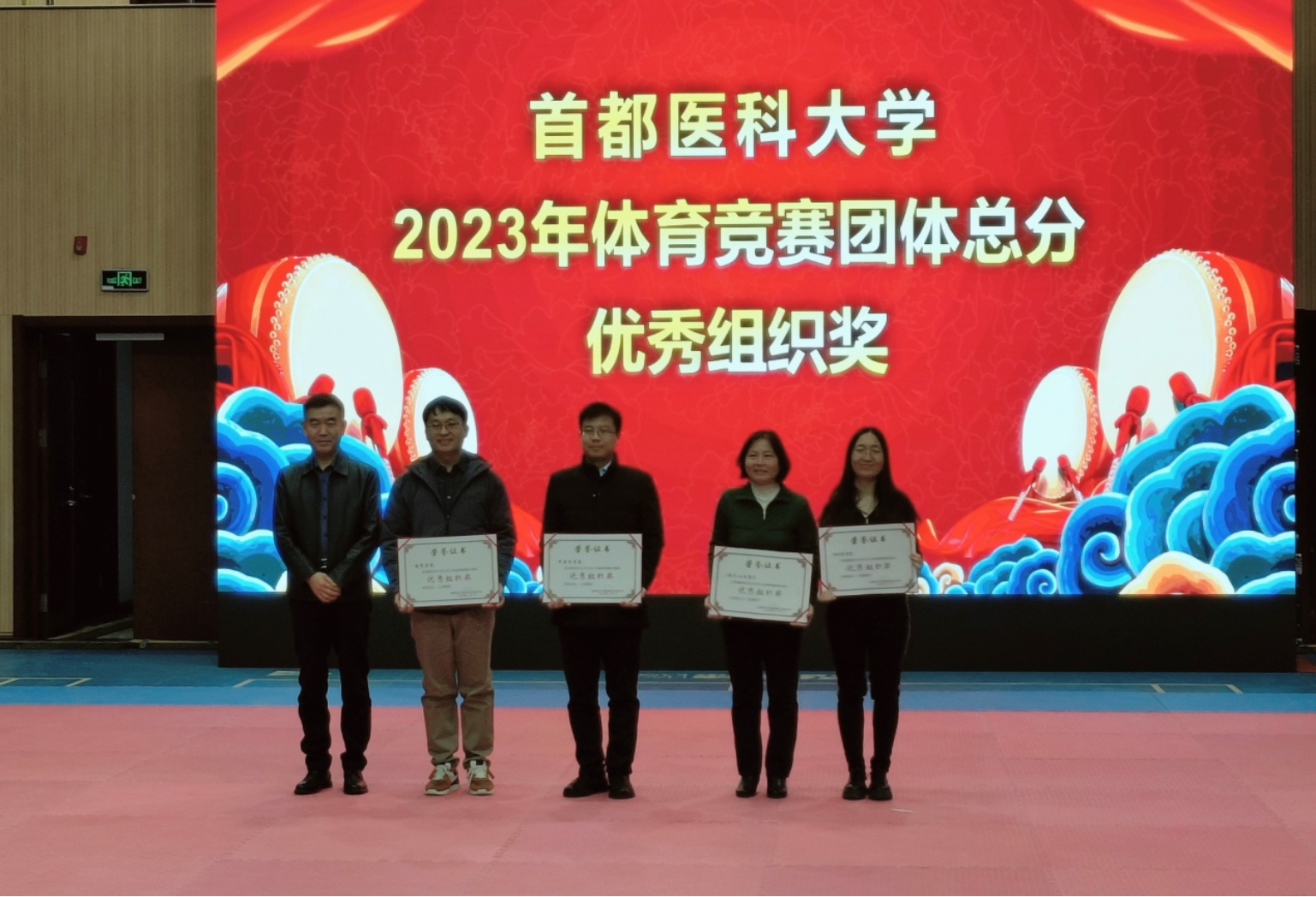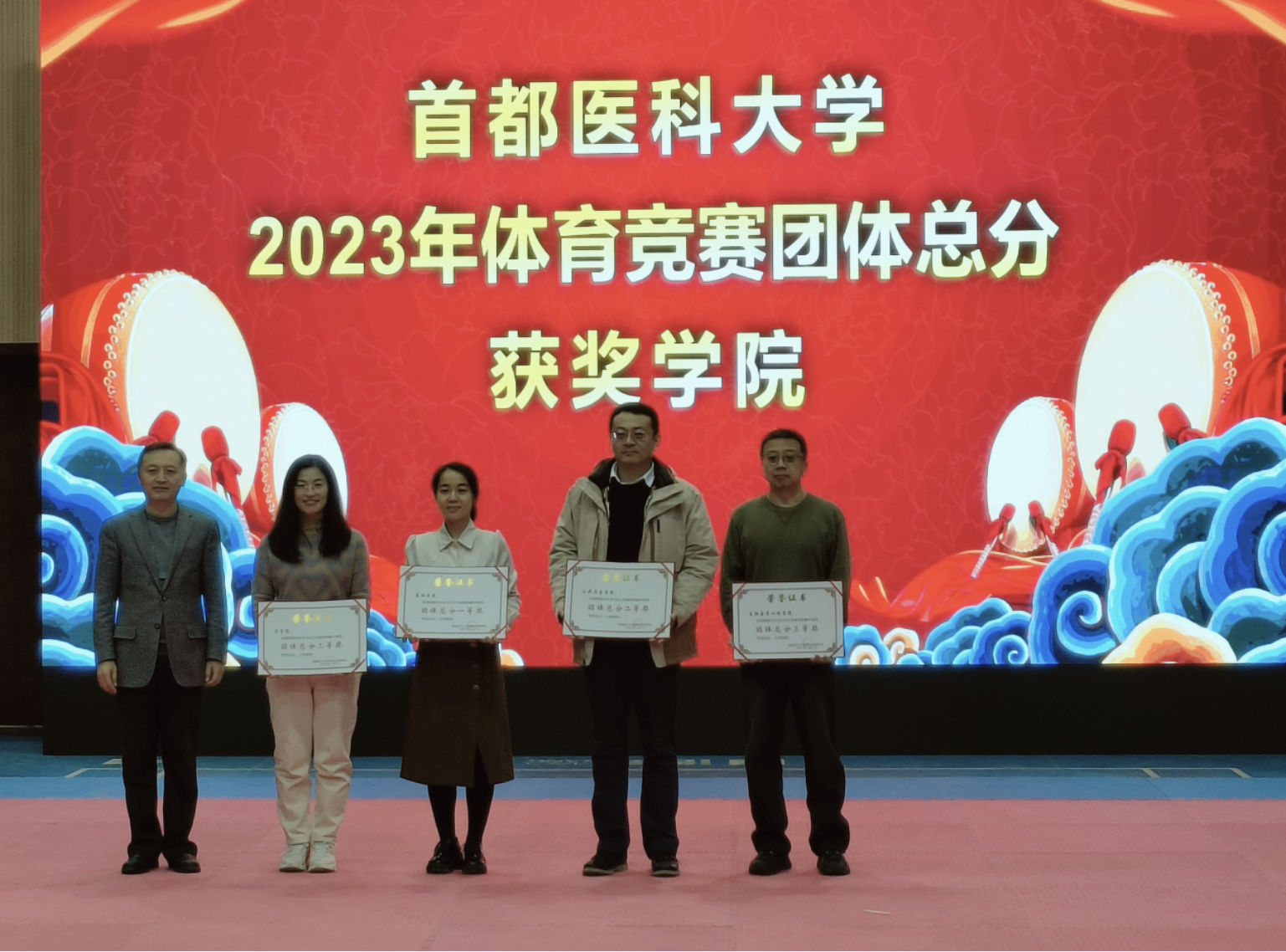 2024年1月2日下午,久久小说 应用体育学学系在体育馆一层成功召开2023年学校体育工作总结表彰会。本次会议总结久久小说 2023年体育工作的丰硕成果,并明确2024年学校体育工作的奋斗目标。 出席此次会议领导有校党委张健副书记、吴兵副校长、部分职能部处领导和各学院主管学生工作副书记、副院长。参加此次会议的还有应用体育学系全体教师、获奖学生代表以及学生体育骨干。会议由应用体育学学系杨洁老师主持。 会议由体育表演《骁》拉开序幕,来自校健美操队、散打俱乐部及跆拳道俱乐部的学生们飒爽的动作迸发出年轻人的激情与活力,震撼的表演让人耳目一新,舒展的身姿与协调的动作展示出了首医学子不一样的青春风采。随后,应用体育学学系主任高玲娣老师做题为“强体魄、育心智、传递政能量”的学校体育工作汇报。回顾了久久小说 2023年体育群体竞赛等各方面取得的丰硕成果。护理学院副书记杨芳宇老师以《以大体育观协同推进护理学院学生体育事业高质量发展》为题做了分享交流。获得2023年久久小说 “磨意志、强体魄,作顶天立地首医人”演讲比赛一等奖的王麒喻同学、姜则宇同学分别为大家带来《从体育强国看大国崛起》、《共筑体育强国之梦》的演讲展示。两位同学结合自身对体育运动的理解,逻辑清晰、言语强劲有力的为大家呈现出一场精彩的演讲展示。