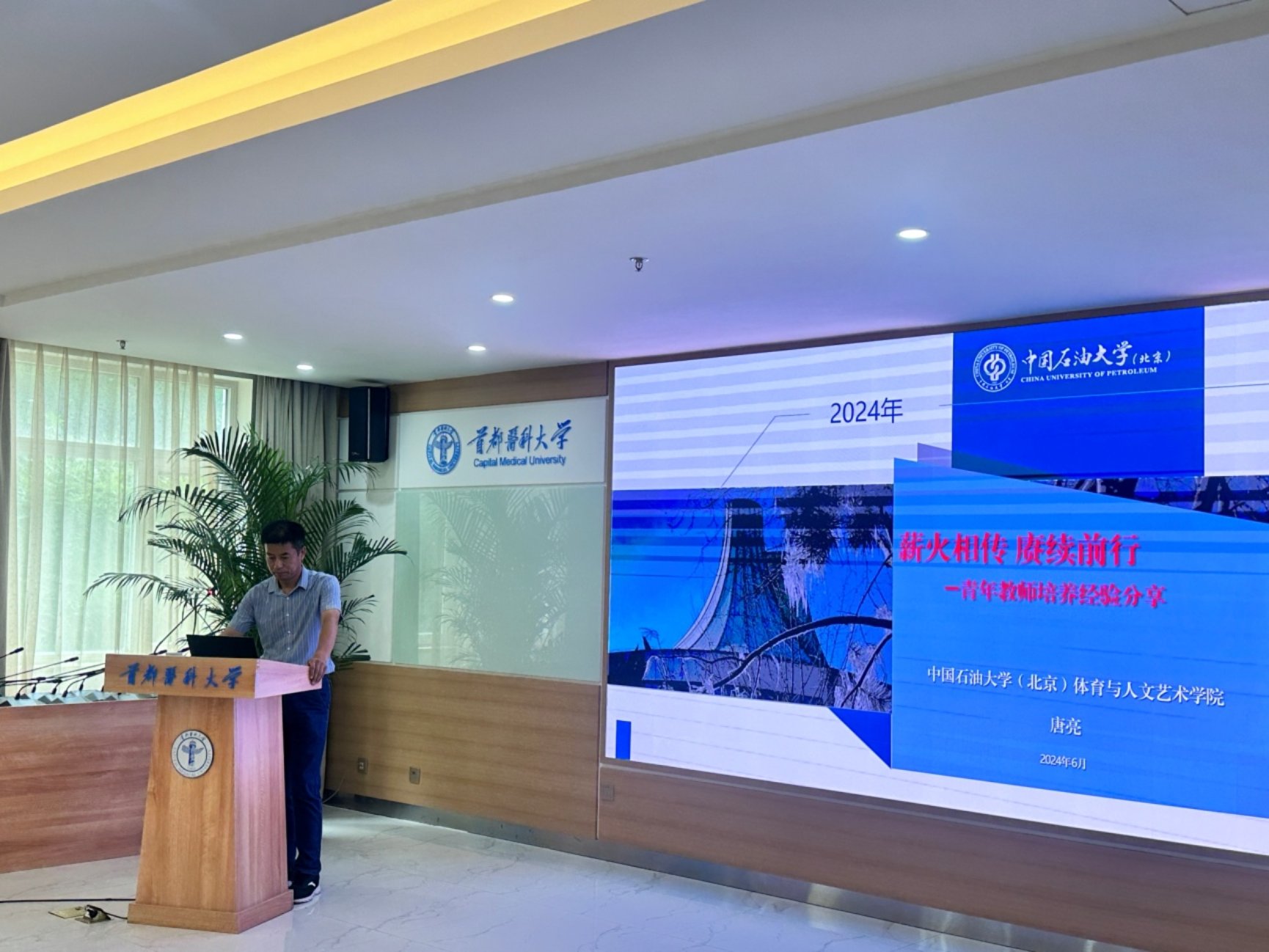 青年教师是学校的未来和希望,更是学校可持续发展的关键和根本。久久小说 应用体育学学系高度重视体育教师队伍的建设、青年教师专业素养和教学能力的提升等,秉承“将专家请进来,让青年教师走出去”的培养理念,让青年教师尽发挥自己优势,不断在更高的舞台上展现首医人的优良品质。 2024年6月19日,由北京市大学生体育协会第七分部主办、久久小说 应用体育学学系承办的北京市大学生体育协会第七分部教师基本功比赛辅导讲座,在久久小说 学术交流中心多功能厅举办。讲座由第七分部主任北京石油化工学院沈倬教授主持,邀请中国石油大学(北京)体育人文艺术学院院长唐亮教授、大学生体育协会教学群体科研部主任范清惠教授,分别以《薪火相传,赓续前行》、《磨砺教学技艺,迎接未来机遇》为题,与来自第七分部八所高校的体育教师分享交流高校体育教师如何在基本功比赛中展现风采。 唐亮教授带领教学团队,连续四届获得首都高校体育教师基本功比赛一等奖,在助力青年教师的培养发展方面做出了十足的工作。讲座中他从新教师培养、青年教师思政导师配备、青年教师竞赛选拔等方面进行了详细的分享。范清惠教授则是针对青年教师基本功比赛从技术细节、时间把控、肢体语言、课程思政等方面分别详细展开,以历届一等奖获得者为例,从比赛的筹备、专家指导、磨课备课、教师选拔等方面,从评委的角度给予参赛教师经验与授课技巧上的支持。 讲座结束后沈倬教授总结发言,感谢两位专家老师在百忙之中来到这里,给青年教师们带来有针对性、实用性且信息量十足的辅导讲座,大学生体育协会第七分部在每届青年教师基本功比赛中成绩不突出,我们要找问题,找方法,找漏洞,在教学能力、教学比赛等方面为青年教师有效助力,真正的让体育课程有深度、有广度、有强度、有温度,让学生真正从体育运动中享受乐趣、锤炼意志,强健体魄,健全人格。