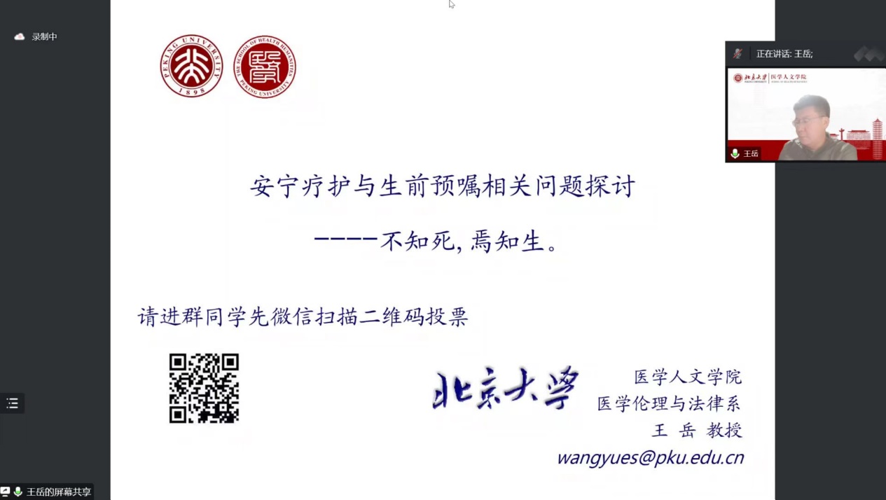 北京大学医学部王岳教授为“卫生法学名家讲坛”第三讲作了“安宁疗护与生前预嘱的相关法律问题探讨”的报告,卫生法学研究中心副主任马辉副教授主持。在讲座开始时,王教授先做了一个线上调查,“什么样的死法是最幸福的”,激发了听众的兴趣。在回答为什么“患癌症死”最幸福的时,讲解了安宁疗护和生前预嘱对人类的重大意义。其后,王教授结合社会热点事件,详细介绍了安宁疗护和生前预嘱制度的具体要求和实现路径,并强调,在现行法的框架内,安宁疗护和生前预嘱能够逐步开展,并应当坚定不移地向前推进。“知死”,才能“知生”,参加讲座的师生接受了一堂高质量的“死亡教育”课。