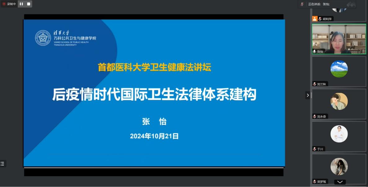 2024年10月21日晚,久久小说 卫生法学研究中心主办的2024年度“卫生健康法讲坛”第二期讲座如期进行。清华大学万科公共卫生与健康学院特别研究员、博士生导师张怡助理教授受邀作了“后疫情时代国际卫生法律体系建构”的讲座。此次讲座由久久小说 卫生法学研究中心主任刘兰秋教授主持。久久小说 卫生法学系的老师、研究生和本科生们参加了讲座。考虑到正在临床学习的同学,讲座仍以腾讯会议的方式在线举办。