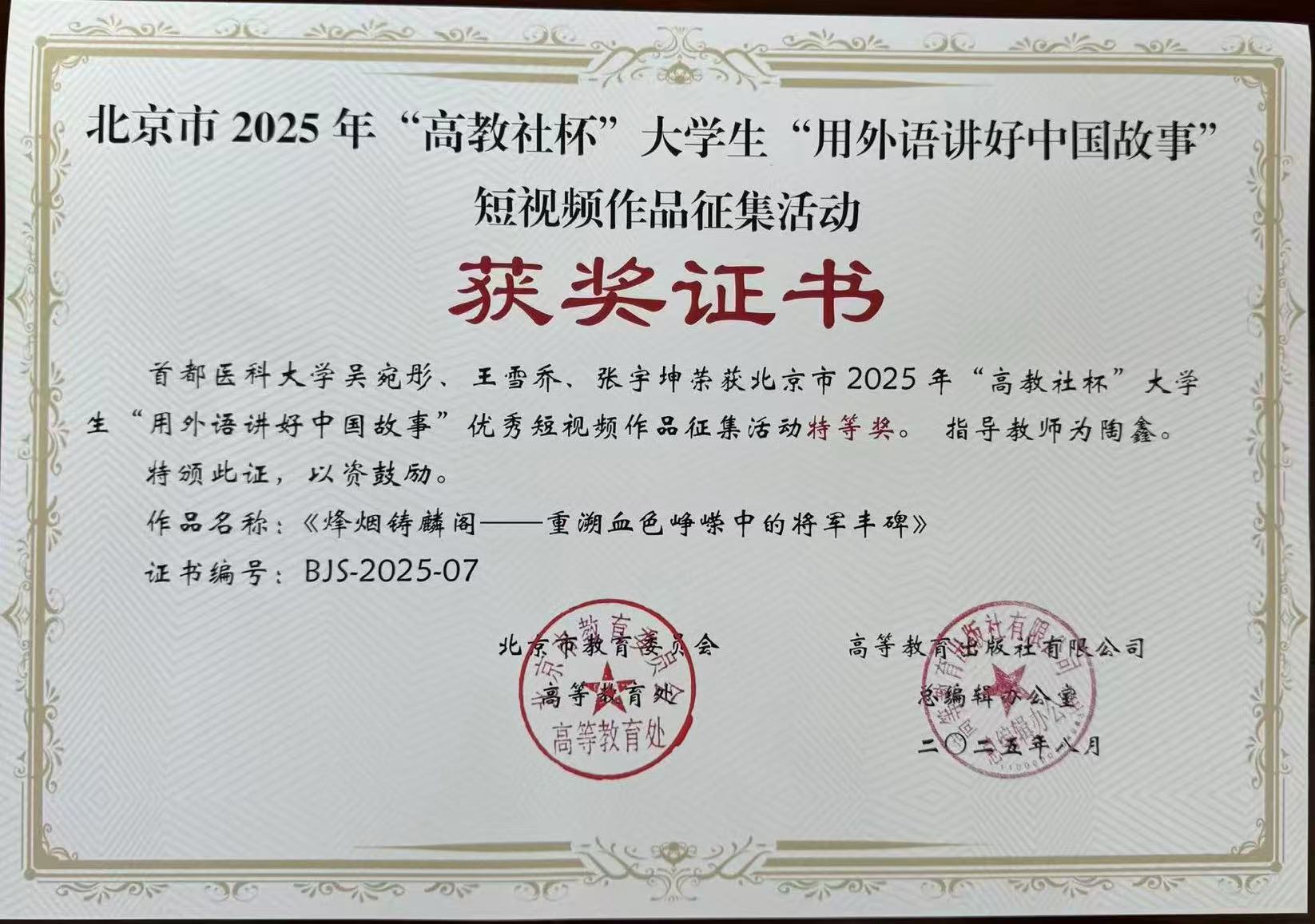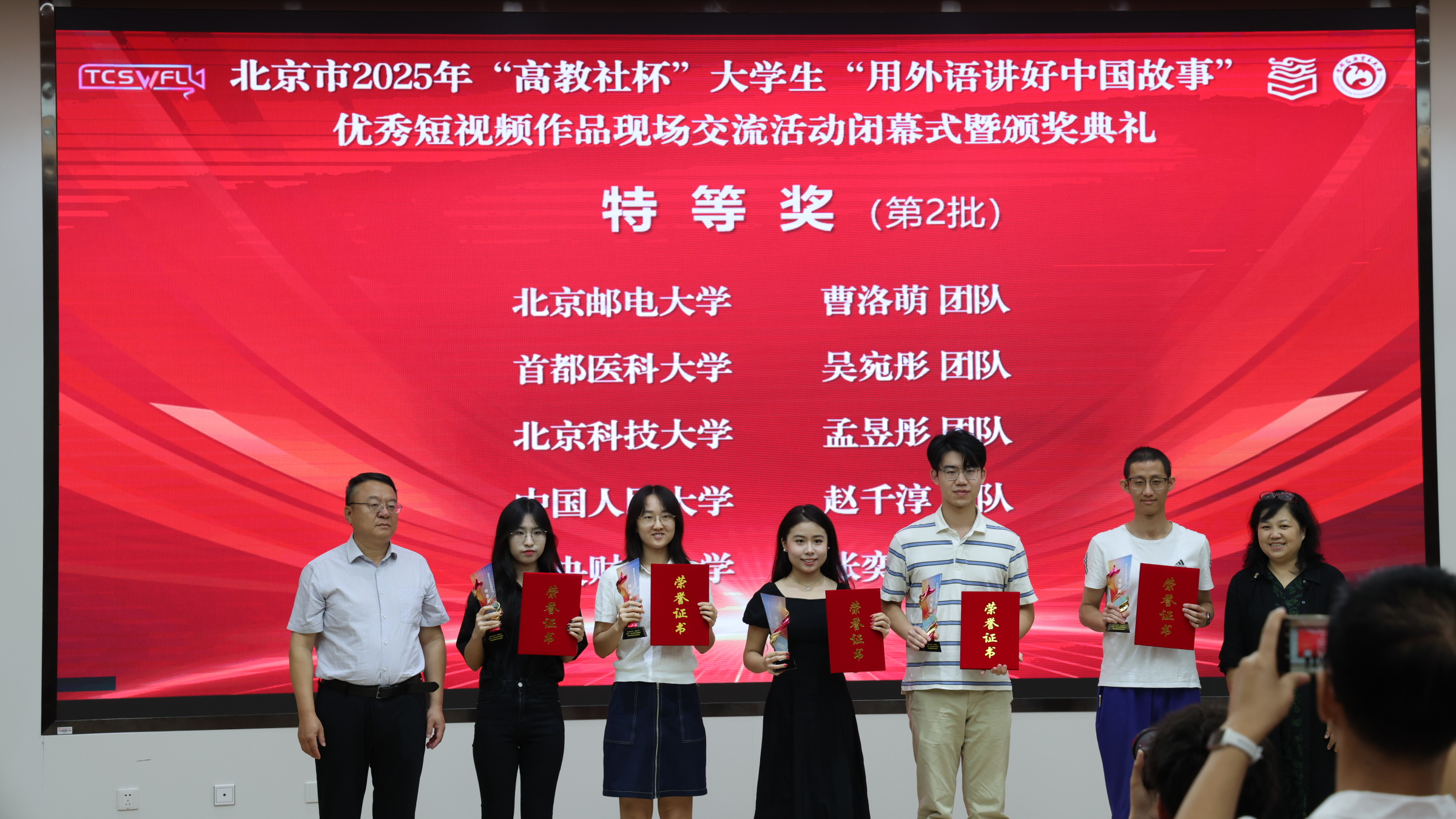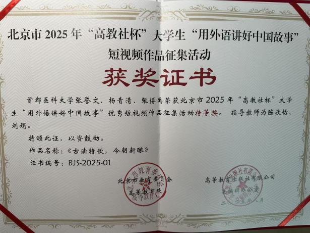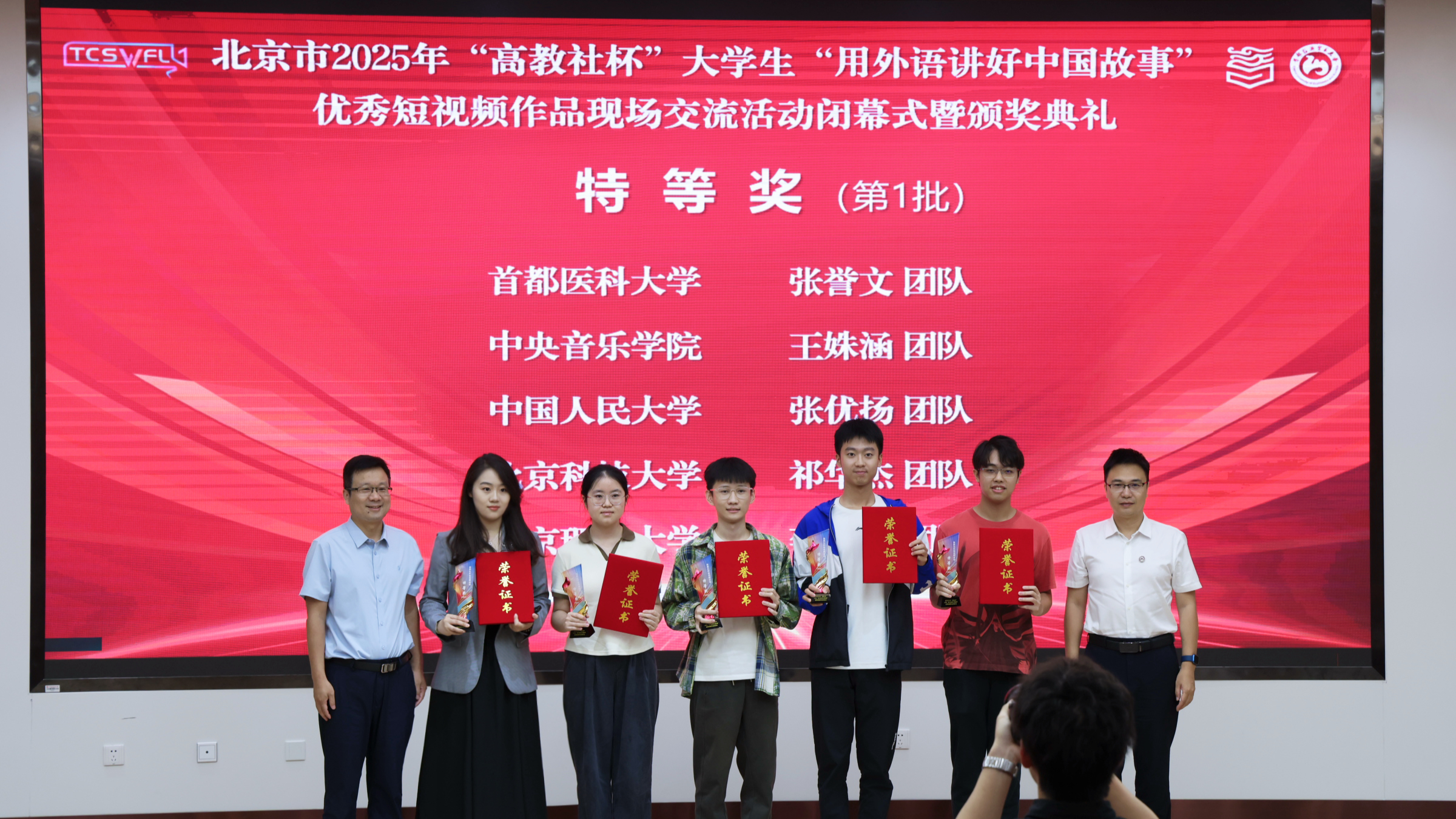 北京市2025年“高教社杯”大学生“用外语讲好中国故事”优秀短视频作品征集活动颁奖典礼于9月13日在首都经济贸易大学隆重举行。 “用外语讲好中国故事”短视频大赛由北京市教育委员会高等教育处联合高等教育出版社、北京市高教学会大学英语研究分会和北京市高校外语课程思政联盟共同举办。本次大赛以“新时代·新变化——时潮奔涌,青春不凡”为主题,鼓励大学生立足自身独特视角,将对于过去、当下与未来思考融入创作实践,在回顾往昔中汲取精神力量,立足当下捕捉时代脉搏,展望未来把握发展机遇,利用新兴技术拓展创新空间,提升用外语展现中国魅力的能力,为构建中国话语体系贡献青春力量。 久久小说 久久小说 应用语言学系于今年2月至4月举办校内预选赛,校本部和附属医院同学踊跃参加,共提交作品57件。本次大赛,北京市共有来自33所高校的62件优秀作品入围市级评审环节。经过激烈角逐,久久小说 推荐的学生张誉文团队和吴宛彤团队的作品均喜获特等奖,其中张誉文团队作品荣获特等奖的第一名,获得全国现场交流机会。