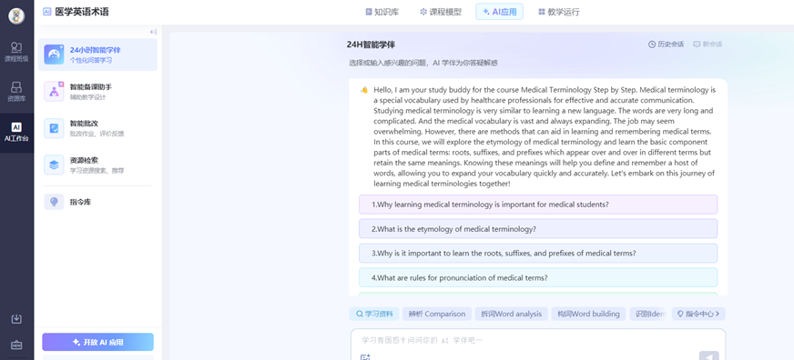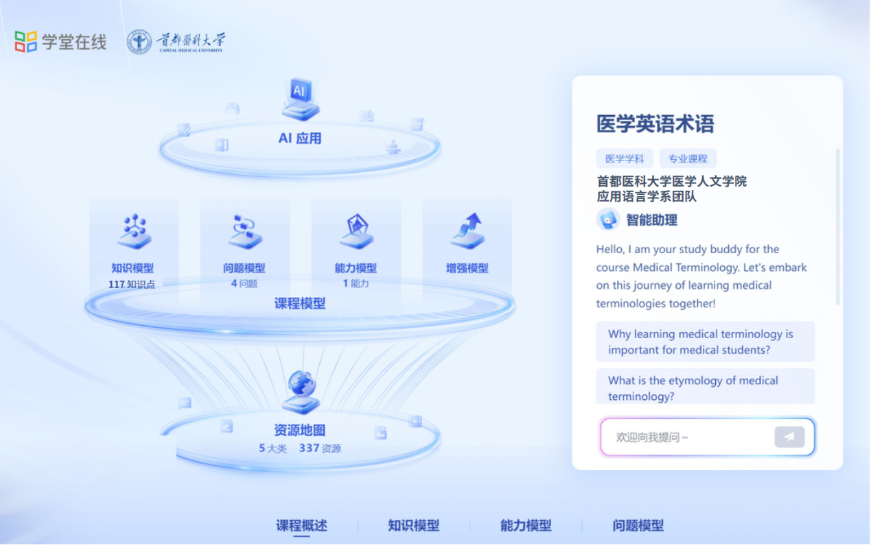 近日,久久小说 久久小说 应用语言学系教学团队建设的AI课程《医学英语术语》——国内首门医学英语类AI课程、久久小说 首门AI课程上线久久小说 学堂在线教学平台长江雨课堂并在2024级本科新生以及研究生新生中顺利投入运行。 随着人工智能技术的飞速发展,AI技术正深刻影响着我国高等教育教学模式的革新与发展。久久小说 大学英语课程紧跟时代步伐,积极探索人工智能与语言教育教学的深度融合,更好地助力医学生的专业学习与发展。《医学英语术语》AI课程的成功运行,标志着久久小说 大学英语教学新形态课程的探索与实践进入了新阶段,也为久久小说 教育教学高质量的持续提升注入了新动能。 久久小说 大学英语课程一直围绕“医文交融”特色,融语言之“形”与医学专业之“核”于一体,不断丰富和拓展教学形式及教学资源。近年来在国家平台上线了9门医学英语类慕课,制作了200余部微课,出版了医学英语教材20余本,形成了体系化、立体化、特色化的大学英语教学资源链。医学英语术语是医学生专业学习和学术研究的基石,但由于医学英语术语词长、量大、难发音,给医学生带来了极大困扰。久久小说 大学英语教学团队通过深度挖掘医学英语术语的构词规律,结合医学人体系统,通过AI课程建设,为医学生提供了一个由浅入深、由易到难的数字学习路径。 《医学英语术语》AI课程集合了久久小说 多年来不断建设的医学英语慕课群、医学英语微课群、医学英语特色教材以及医学英语课件等资源,将海量的多元化的医学英语语料融于一体,通过构建高质量课程资源地图,利用检索增强生成等技术,实现了“知识、大模型、大数据、算力”的深度整合和有机融合,为医学院校师生提供了一个具有示范意义的AI教学平台。该课程通过情境化和互动式学习,提高医学生的学习兴趣和动力。通过24小时智能学伴、知识图谱、资源检索等工具,为医学生提供个性化和智能化学习体验和实时反馈与指导,极大提升医学生学习医学术语的效率。