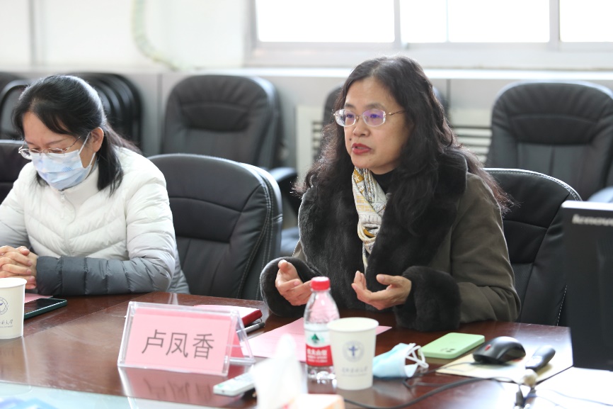 院长卢凤香教授、应用语言学系骨干教师出席会议,学系主任谢春晖教授主持会议。 在交流座谈会上,卢凤香教授首先代表学院对郑愿华院长一行来久久小说 调研交流表示热烈欢迎,她说,大兴调查研究被习近平总书记赋予了新的时代内涵,两校在全国两会之后的此次交流是贯彻落实党的二十大精神的生动实践,必将对两校英语教学质量的提升、优质教学资源的共享共用、学科建设的内涵式发展发挥积极作用。 谢春晖主任介绍了学系的基本情况以及学系以培养医学生高层次思维能力为导向、以提升医学生语言产出能力为核心、以助力医学生医学专业能力提升为根本,依据学科特色开展科学研究和教学实践、依托医学英语教学资源链重构课程教学内容、依靠高水平师资队伍保障医文交融教学落实的课程建设与学科发展思路;分享了久久小说 研究生教学以网络为依托、以需求为导向、以课堂面授与在线学习混合式教学为驱动、以过程性和终结性评价以及个性化评测为引导、以慕课/微课资源建设为突破,分类教学、分层指导的“五位一体”课程体系的建立及线上线下混合式教学模式的实施经验与思考。刘娟副主任介绍了久久小说 大学英语教学改革的定位与目标、理念与举措及取得的成效和评价。