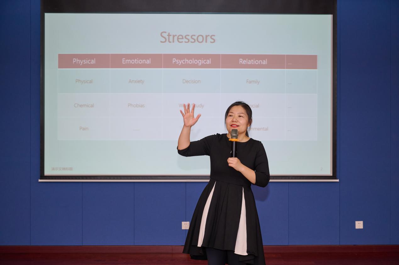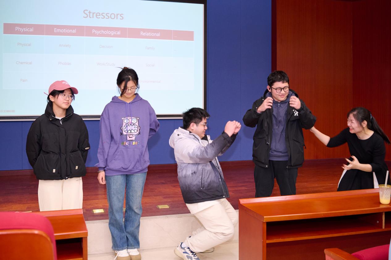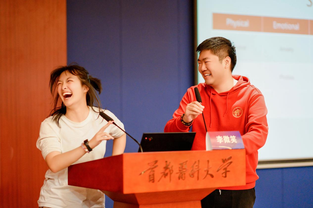 合影 讲座中,李微笑博士用丰富的肢体语言带领大家了解自身主要的压力源,即社交、情绪和身体。随后,通过同学们自由组队进行“幸运、不幸运”的随机性对话,探索由看待事物的不同角度引发的两极化情绪。