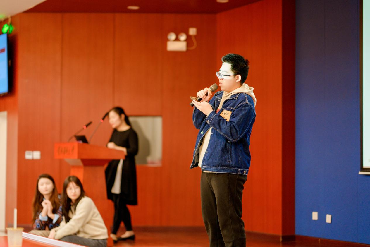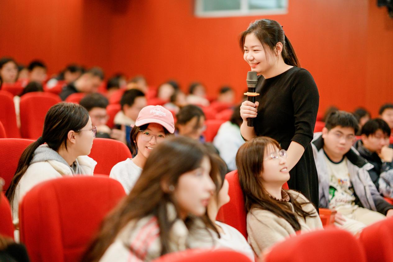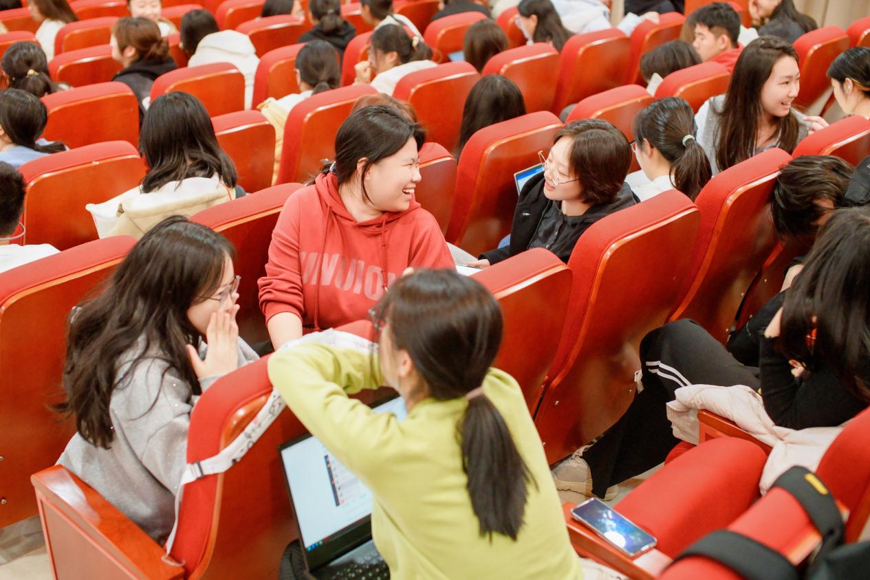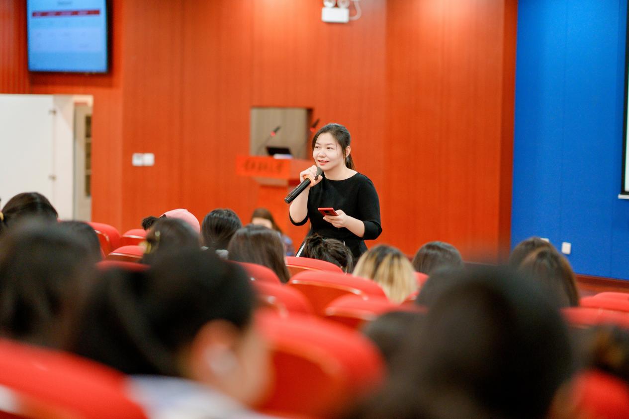 合影 讲座中,李微笑博士用丰富的肢体语言带领大家了解自身主要的压力源,即社交、情绪和身体。随后,通过同学们自由组队进行“幸运、不幸运”的随机性对话,探索由看待事物的不同角度引发的两极化情绪。