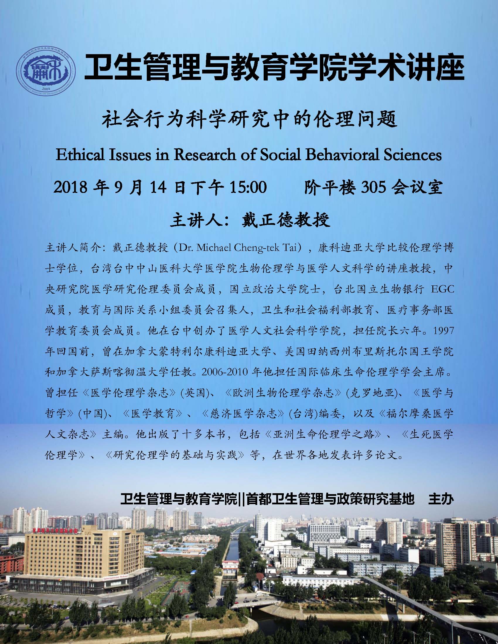 【讲座通知】社会行为科学研究中的伦理问题 2018年9月14日