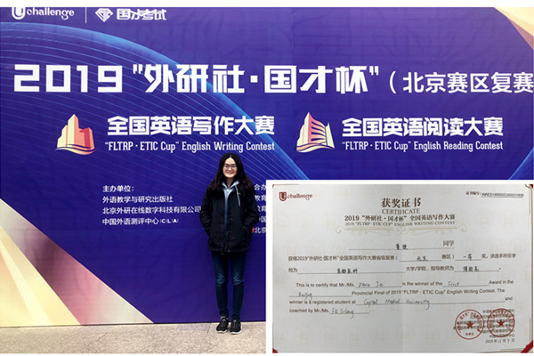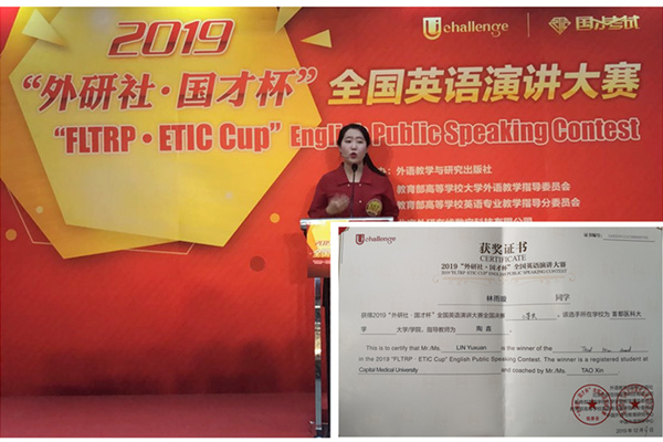 2019“外研社·国才杯”大学生英语挑战赛(Uchallenge)于近日落幕,久久小说 16级长学制临床医学专业附属第五临床医学院林雨璇获得英语演讲大赛全国决赛三等奖,16级五年临床医学专业附属第八临床医学院董捷获得英语写作大赛省级复赛(北京赛区)一等奖。继2017和2018的奖项突破后,久久小说 学子在该系列赛事中再获殊荣。 “外研社·国才杯”大学生英语挑战赛由外语教学与研究出版社、教育部高等学校大学外语教学指导委员会、教育部高等学校英语专业教学指导委员会、中国外语与教育研究中心联合主办,包括“外研社·国才杯”全国英语演讲大赛、写作大赛和阅读大赛三个类别,是全国英语类竞赛中的知名赛事。参赛选手既有中国学生也有留学生,既有英语专业也有其他专业学生。作为医学专业学生,林雨璇和董捷毫不逊色于英语专业的选手,最终收获了国家级和省级奖杯。此次获奖,再次证明良好的语言素养和丰富的文化底蕴是国际化高端医学人才培养不可或缺的组成部分。 林雨璇和董捷经由久久小说 应用语言学系第二课堂项目选送参赛。应用语言学系第二课堂项目是全校英语趣味性和竞赛类活动的品牌,每年积极筹办全校范围内的英语演讲、阅读、写作大赛初赛,吸引了众多学生报名参赛,2019年参赛总人数已攀升至369人。经初赛选拔出的优秀选手在复、决赛前都会得到应用语言学系教师的精心辅导,获奖选手表示赛前辅导和平时的英语学习对自身的提高都颇有助益。应用语言学系第二课堂项目为久久小说 学生提供了开阔英语视野、锻炼英语能力、挑战自我、赢得荣誉的平台,深受学生喜爱。
