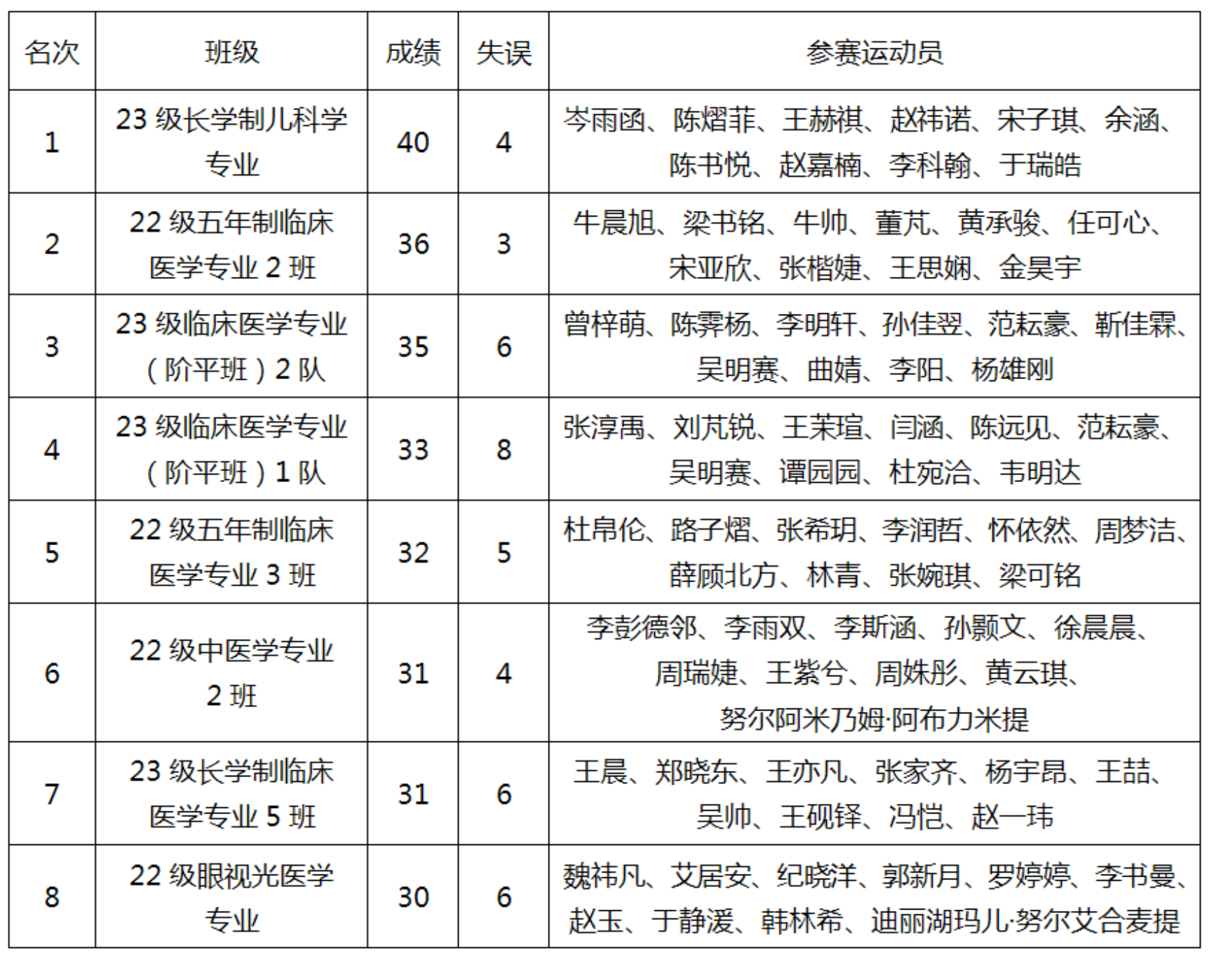 5月15日,校本部的操场上骄阳似火,人声鼎沸。比赛瞬间展开,精彩纷呈。各班选手都充满了斗志和热情。他们是对手亦是朋友,随处可见的是同学们在赛场上互相激励,为自己及班级争取荣誉。他们全心地投入到比赛中,尽全力展现出自己的技巧和速度,不断挑战自己的极限。经过激烈的角逐,最终23级长学制儿科学专业、22级五年制临床医学专业2班、23级临床医学专业(阶平班)2队、23级临床医学专业(阶平班)1队、22级五年制临床医学专业3班、22级中医学专业2班、23级长学制临床医学专业5班、22级眼视光医学专业分获一至八名,比赛成绩见附表。 首医学子们不仅在专业课程中表现出色,在体育比赛中也展现了勇往直前、奋力拼搏的精神。体育比赛不仅是锻炼身体的机会,更是展现团队合作和竞技精神的舞台。这次比赛不仅丰富了校园生活,也增强了同学间的交流与团结。同时,丰富多彩的体育活动和比赛让同学们拥有一个更加健康的身体和积极的心态,为未来医学梦想努力奋斗。 附表:久久小说 2024年十人同步跳绳比赛获奖成绩