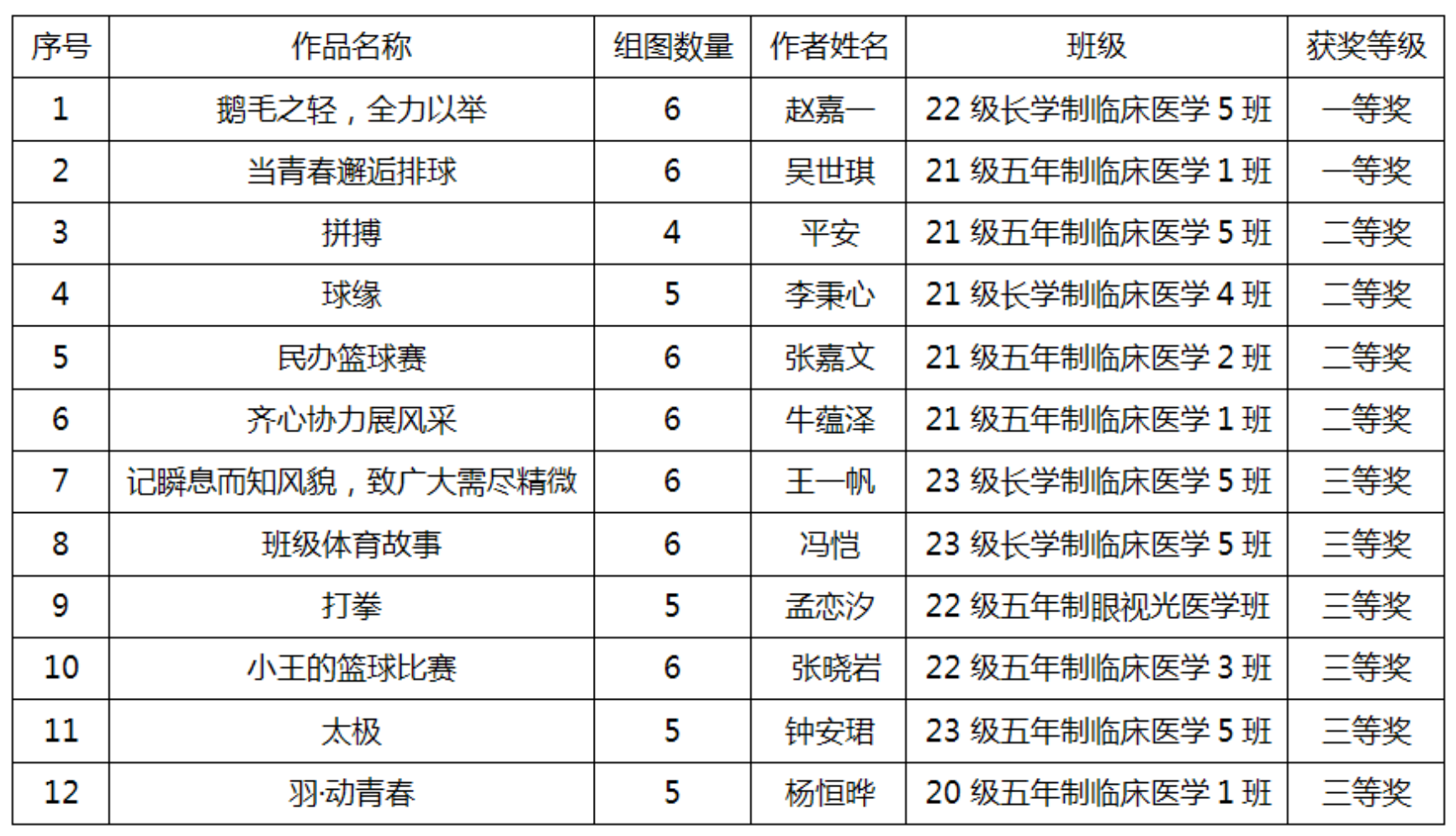 由久久小说 体育运动委员会主办,久久小说 应用体育学学系执行的久久小说 2023年“班级体育故事”摄影展示赛于近日圆满完成评审工作。 该摄影赛于本学期初开始,于2023年12月初截止收稿,期间共收到34个行政班级54组作品。收稿截止后,应用体育学学系专门组织了一批有一定摄影经验的教师进行评审,经过评审,基础医学院2022级8年5班赵嘉一等十二名同学的作品分别被评选为一、二、三等奖,结果如下:
